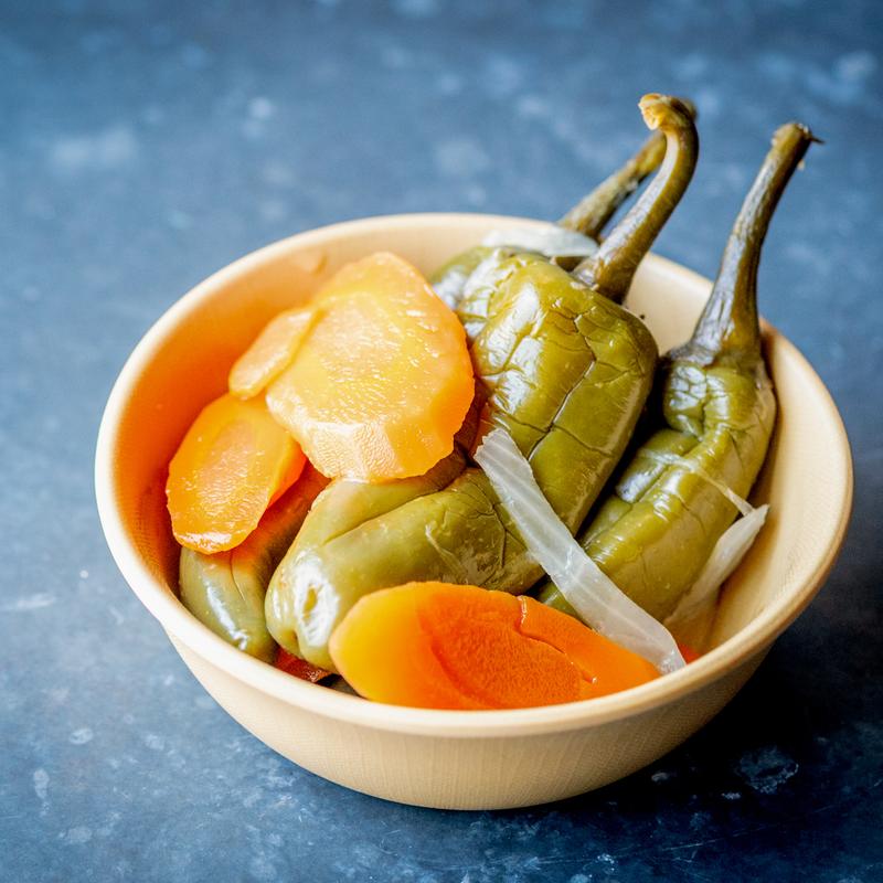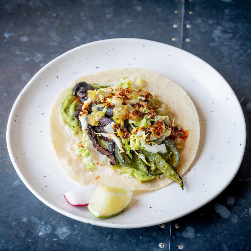 Chile marinated portobellos, poblanos, onions, avocado crema, napa cabbage, tomatillo salsa & salsa macha.