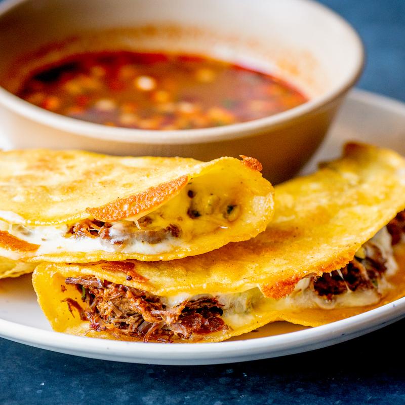 Braised adobo beef & queso Oaxaca griddled on a house tortilla & served with consomé.