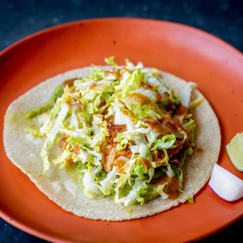 Spice rubbed & grilled red perch, avocado crema, salsa quemada & napa cabbage.